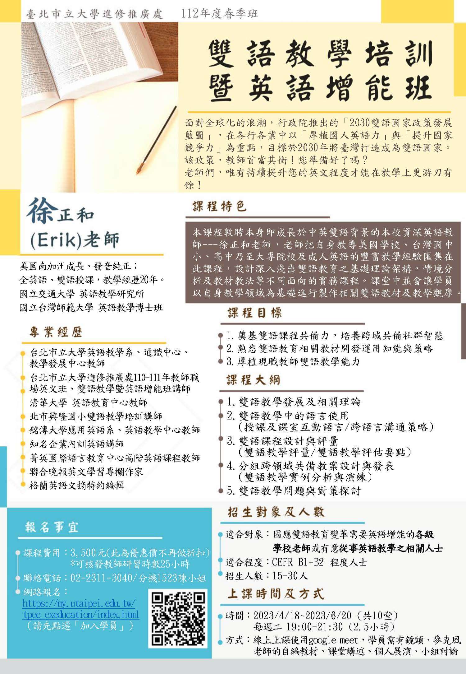 (七)網路報名:請至本處報名網頁報名(https://my.utaipei.edu.tw/tpec_exeducation/index.html)新學員請先於右上角「加入學員」,再於左欄點選「112春-成人進修-雙語教學培訓暨英語增能班」。