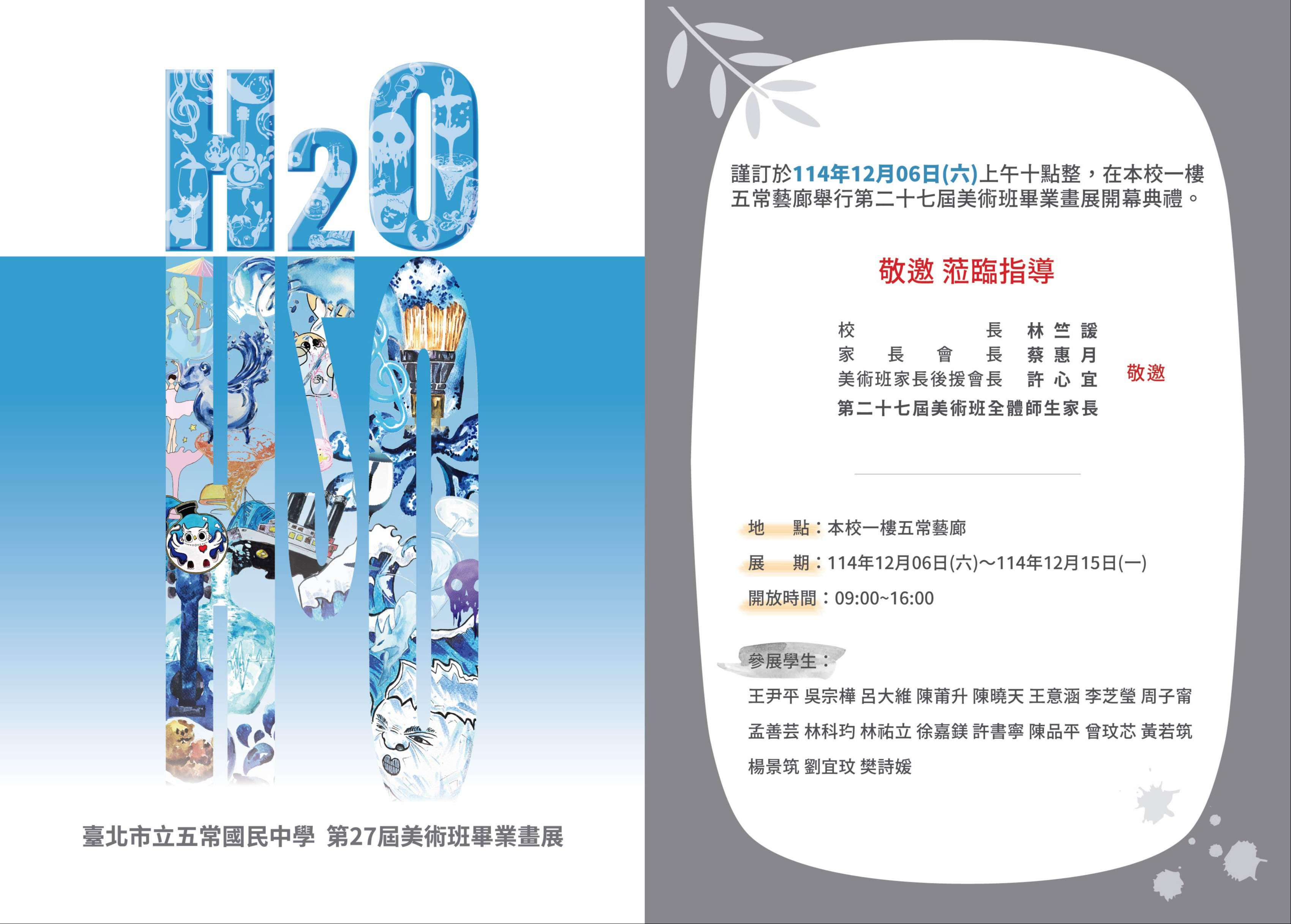一、本校謹訂於114年12月6日(星期六)舉行本校第27屆美術班「H2O」畢業畫展活動,開幕典禮為上午10時舉行,歡迎各界貴賓共襄盛舉。