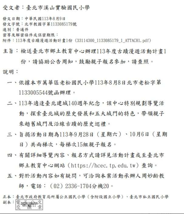 113年適逢臺北建城140週年紀念,該中心特別規劃導覽活動,探索臺北城的歷史發展和五大城門的特色,帶領親子來趟舊城門及沿線古蹟的歷史巡禮。