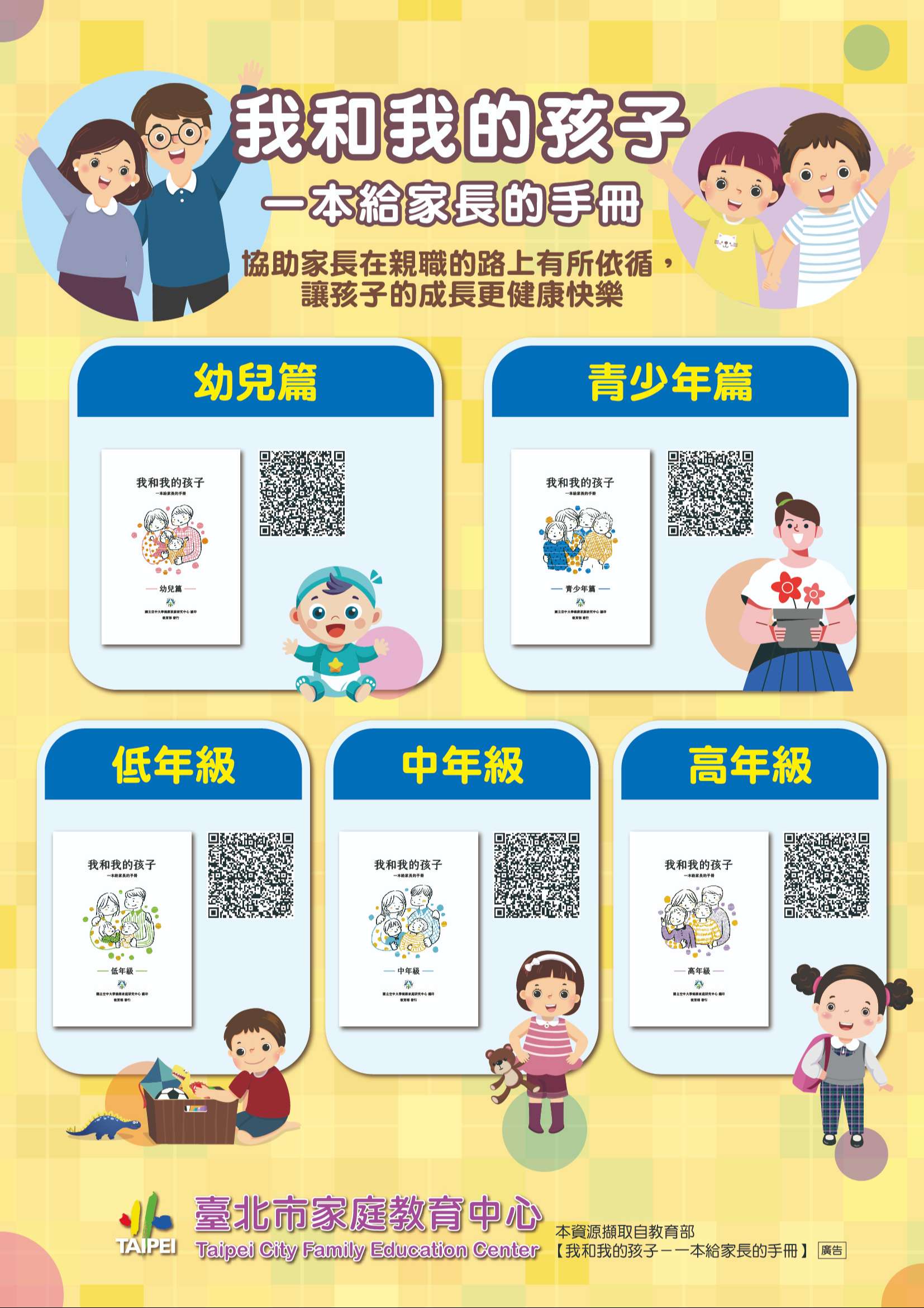一、為陪伴家長與孩子共同經營學校及家庭生活,教育部邀 集 專家學者編製《我和我的孩子-一本給家長的手冊》 親職 教育手冊(包含幼兒篇、國小篇及青少年篇),針對家有 學前、國小及青少年階段孩子的家長,可能面對的親職課 題,透過簡單易懂的條列式小提醒,協助家長輕鬆學習親 職知能及技巧。