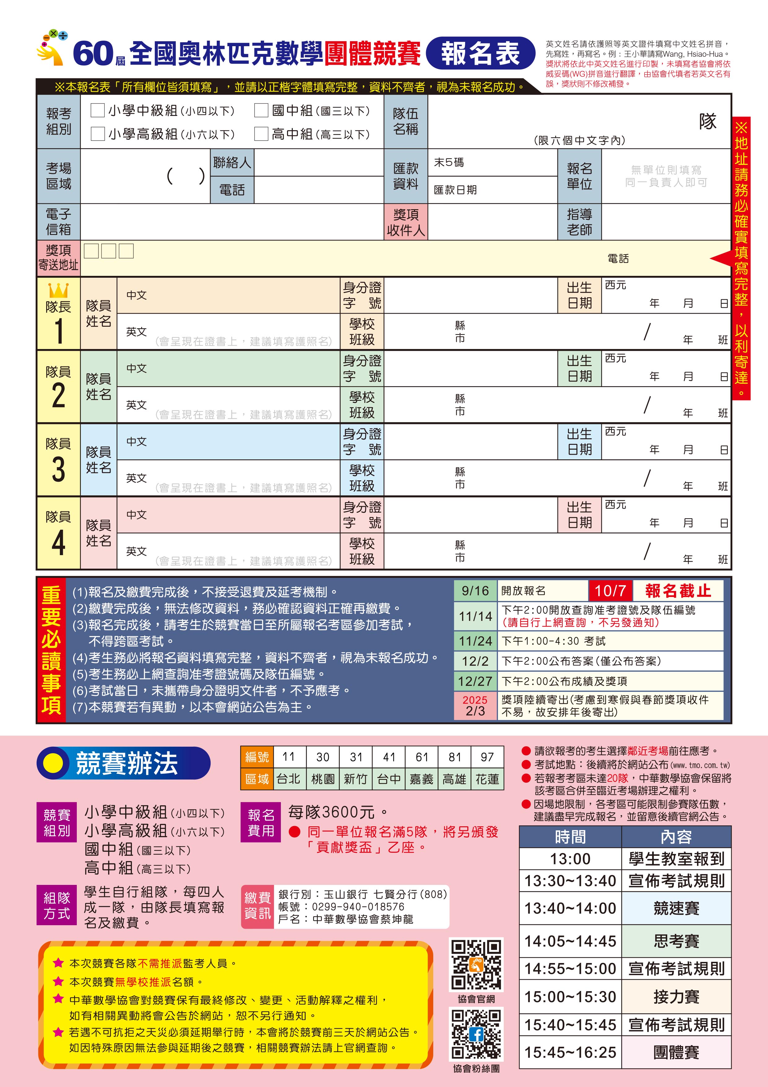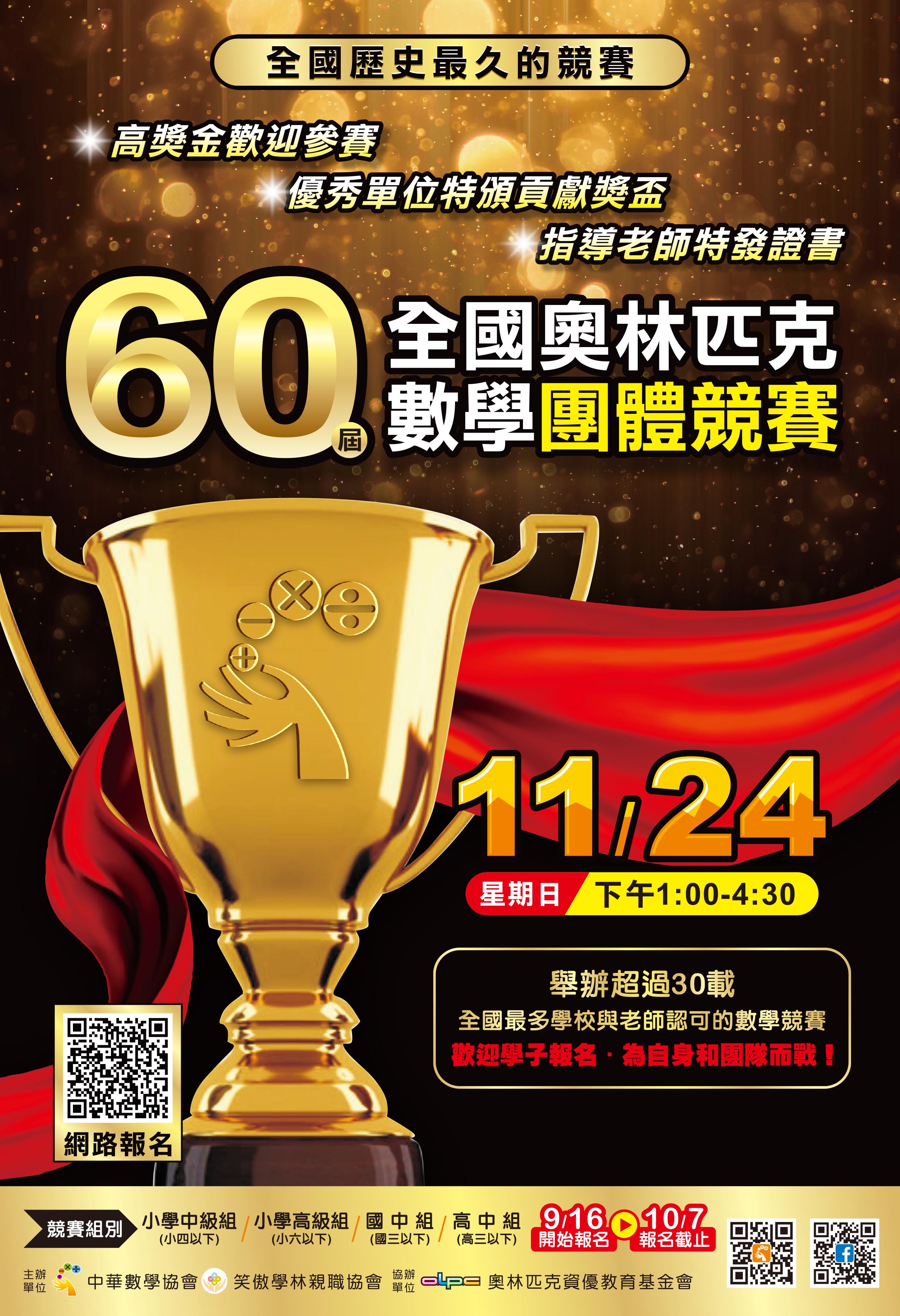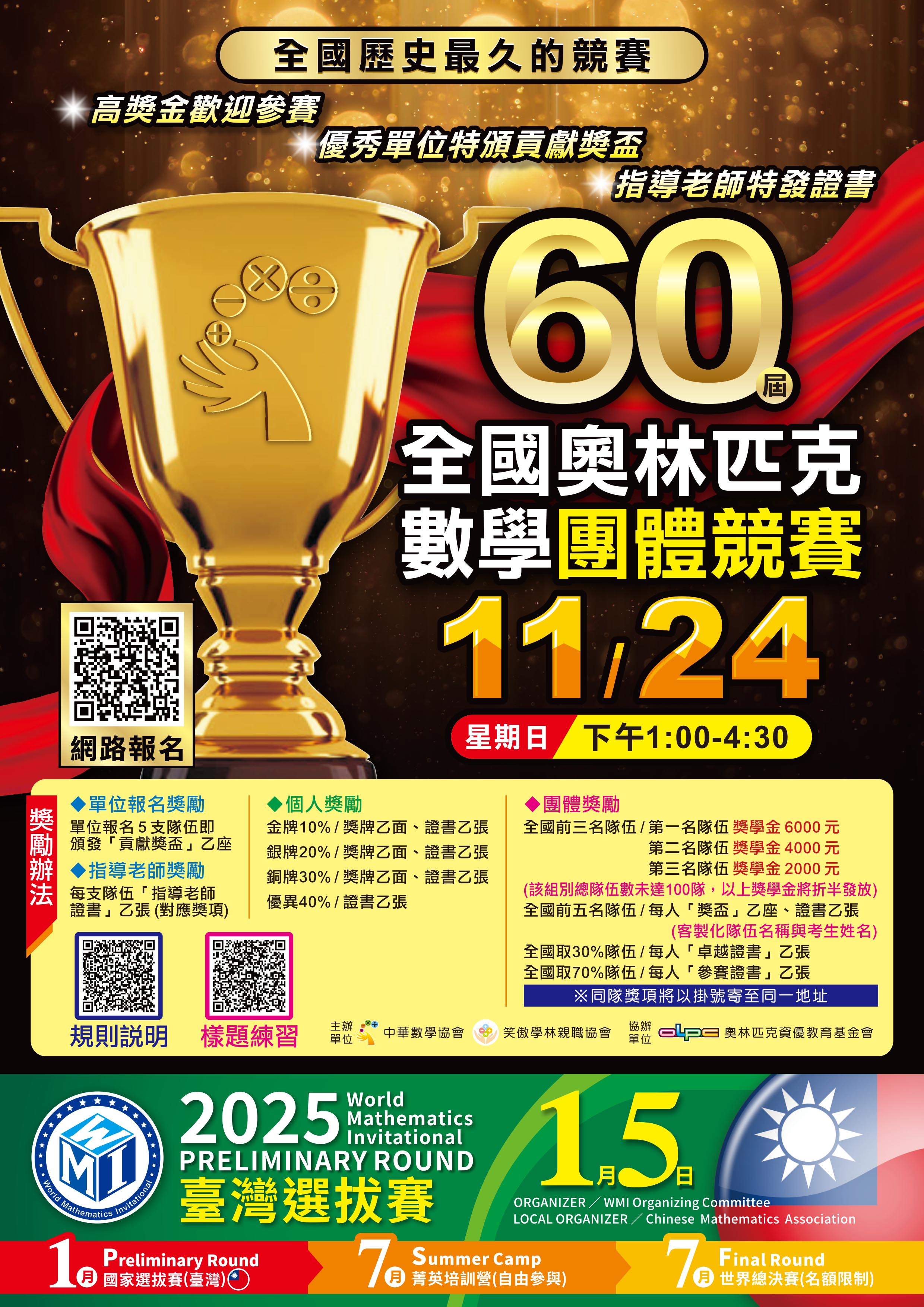 一、「第60屆全國奧林匹克數學團體競賽」競賽活動相關簡章,供 貴校參閱。競賽報名的起訖時間為113年9月16日至113年10月7日止。