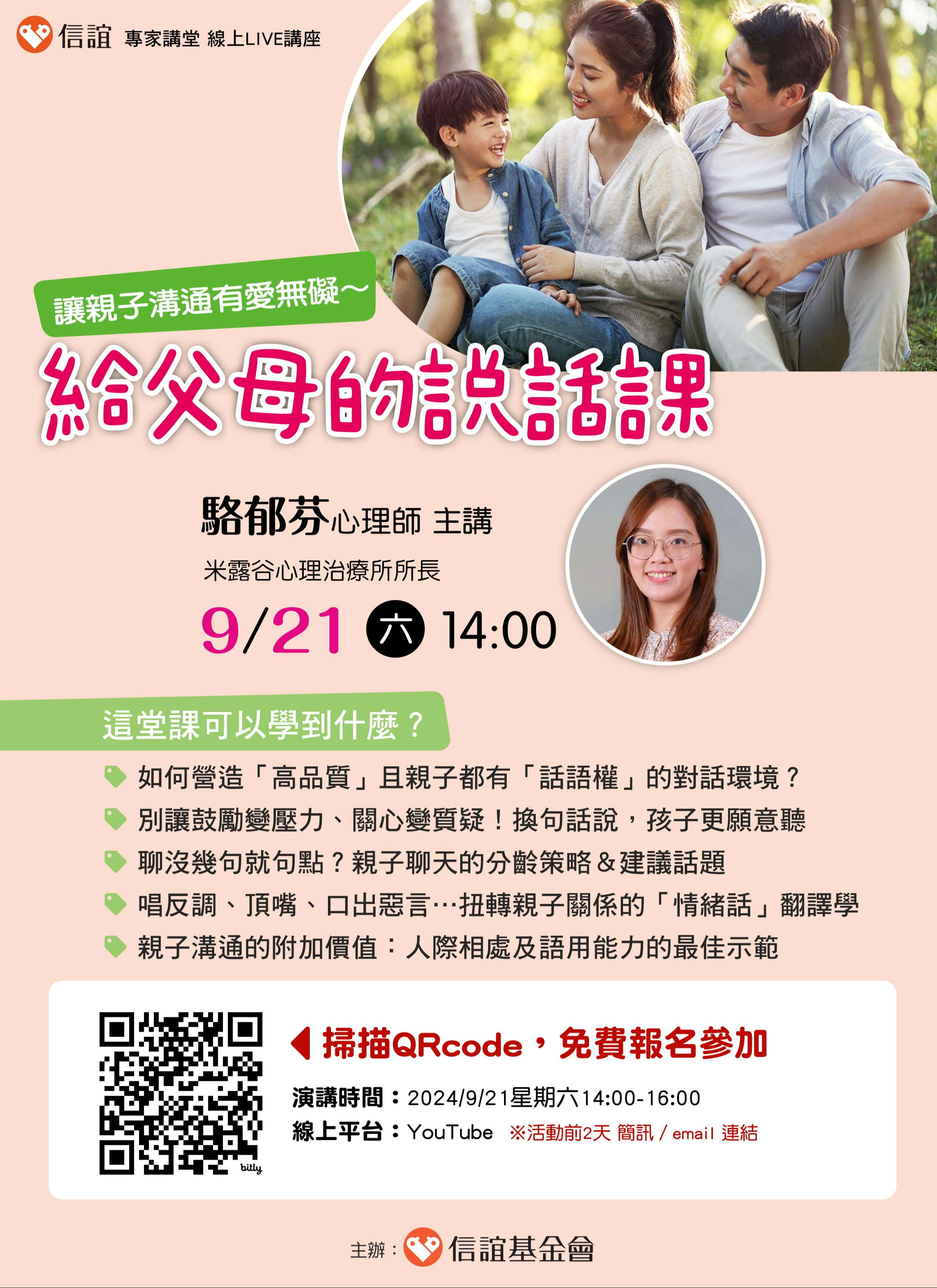 一、親子之間的溝通,不只是傳達大人的想法與期待,也要提 供孩子表達的機會。如何做,能讓孩子感受被理解、被尊 重?如何說,能讓孩子願意聽又不會壞了親子關係?信誼 將於2024年9月21日(六)下午2:00-4:00舉辦【溝通有 愛無礙~給父母的說話課】線上LIVE講座,邀請爸媽免費報 名參加。