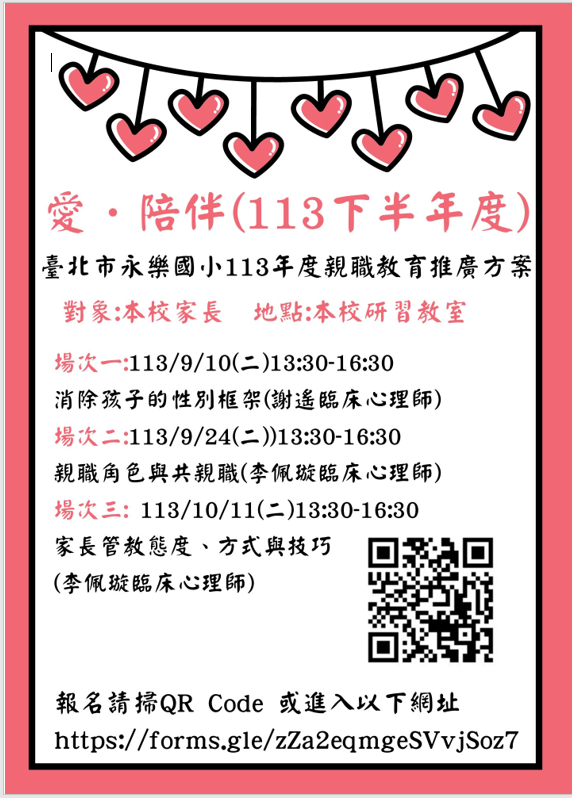 五、報名截止日期:自即日起至講座前一天。報名連結:https://forms.gle/HQKu1oyfXmcgjusF8,或電洽永樂國小輔導室詹老師(02)2553-4882#503。