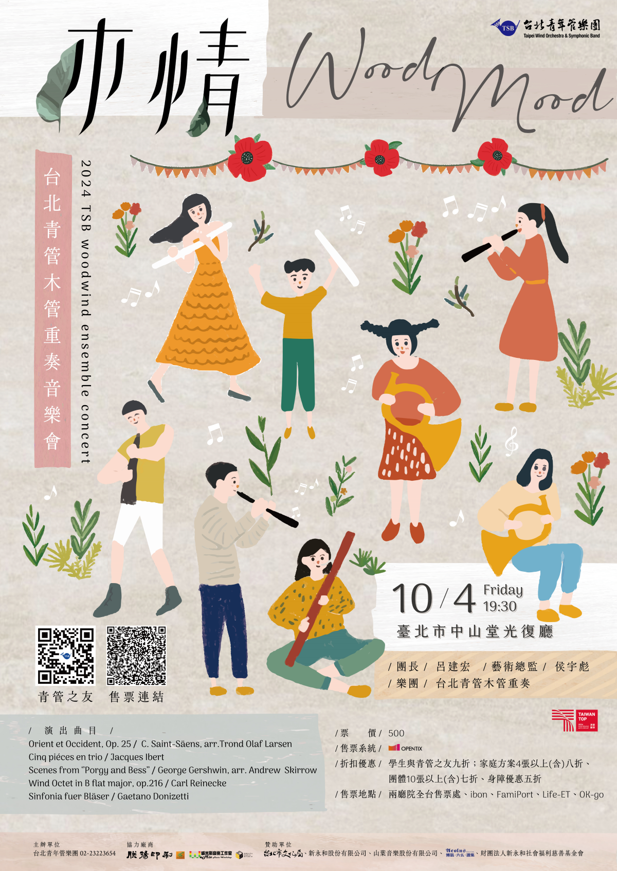 一、2024台北青管木管重奏音樂會,由國內音樂名家與台北青管老師團團員組成;帶來多首經典木管重奏之樂曲,曲目多元豐富,音樂悅耳動聽,是您不可錯過的音樂饗宴。