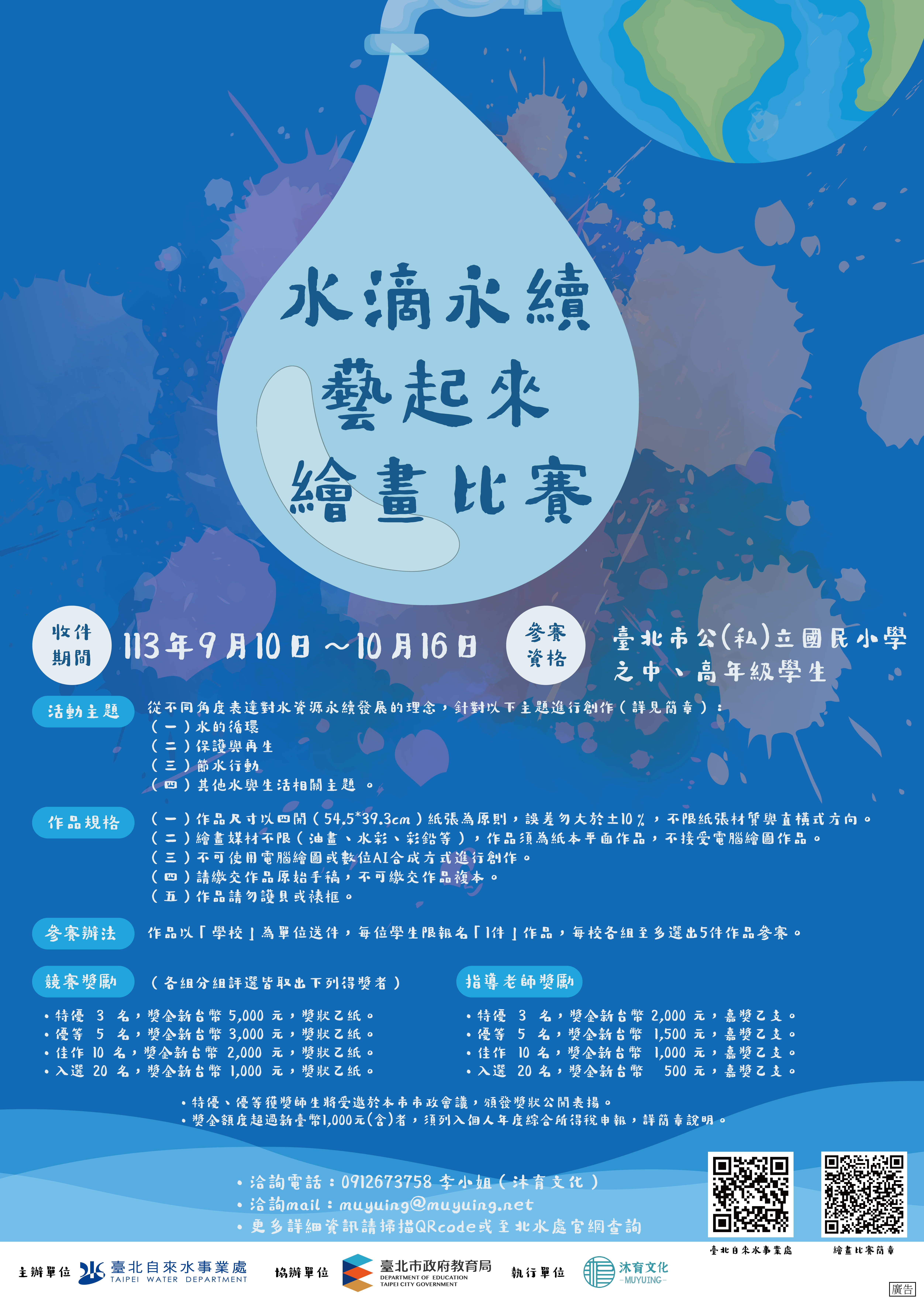 三、檢送113年「水滴永續藝起來」繪畫比賽簡章及海報各1份(如附件)。