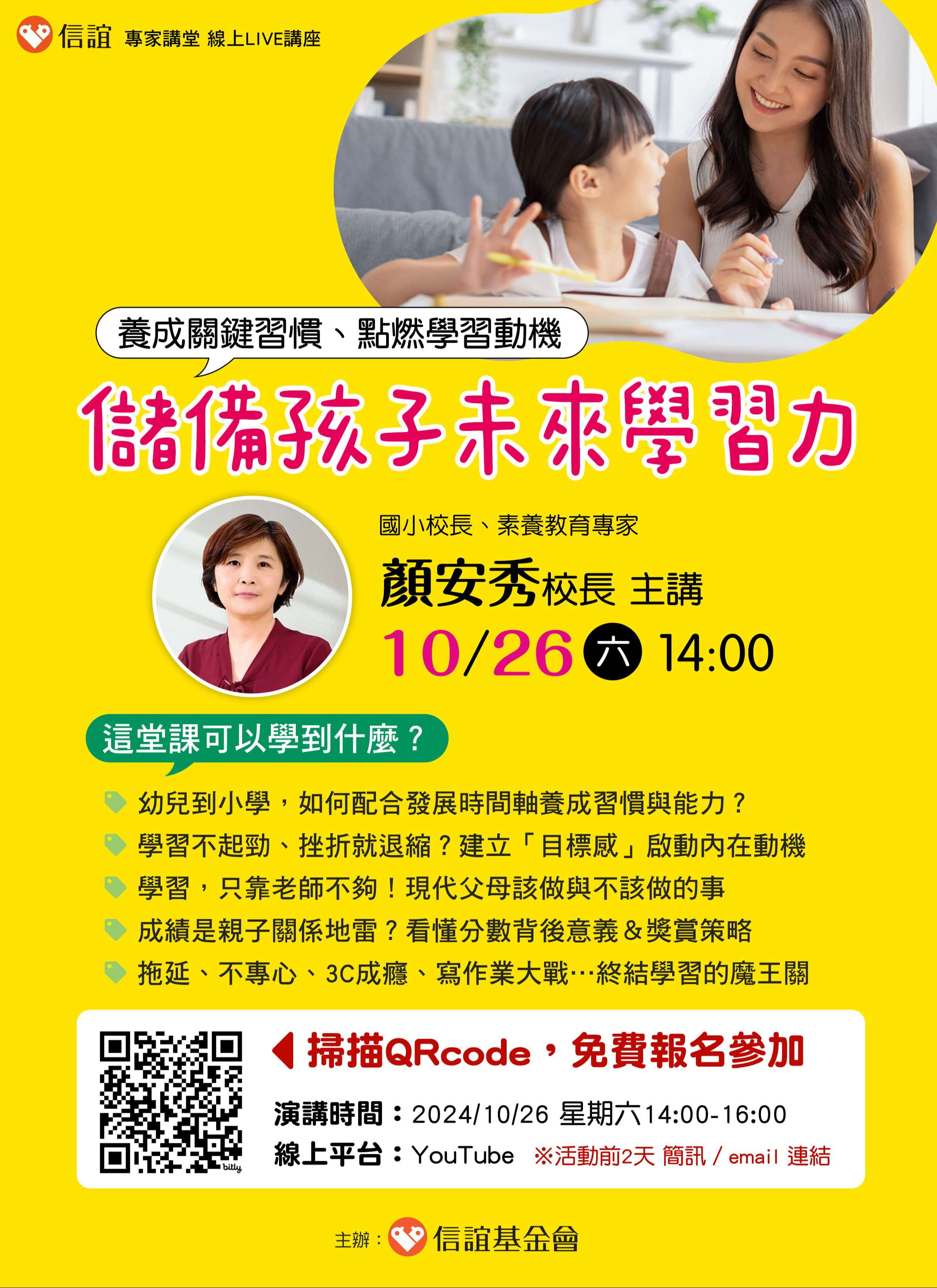 學習,是從出生就開始的事。學習力,則是影響未來很關 鍵的技能。希望激發孩子學習熱忱、學得越來越好,只靠老師是不夠的!爸媽如何做才能幫助孩子儲備未來學習力呢?信誼將於2024年10月26日(六)下午2:00-4:00舉辦 【養成關鍵習慣、點燃學習動機-儲備孩子未來學習力】 線上LIVE講座,邀請爸媽免費報名參加。