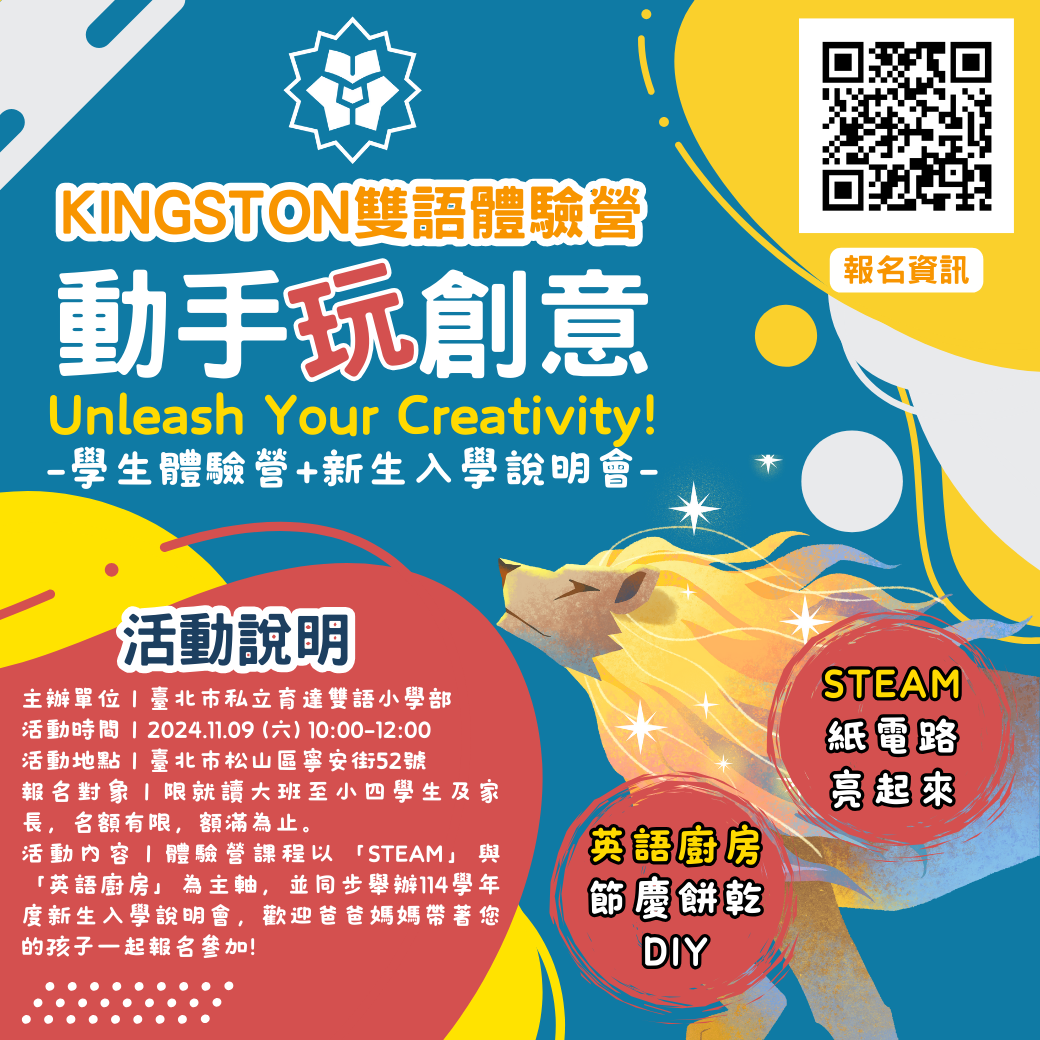 一、目的:點燃孩子的創意火花--【動手玩創意-Kingston雙語體驗營】。在全球化的時代,雙語能力是孩子未來發展的重要資產,本次Kingston雙語體驗營集結本校外師與中師,以「STEAM」與「英語廚房」為主題,設計一系列豐富有趣的體驗課程,除了規劃精采的手作體驗與科學實驗,我們也在同一時間安排114學年新生入學說明會,深入介紹本校的課程規劃與環境導覽,並解答您的所有疑問,歡迎家長帶著您的孩子一起報名參加!