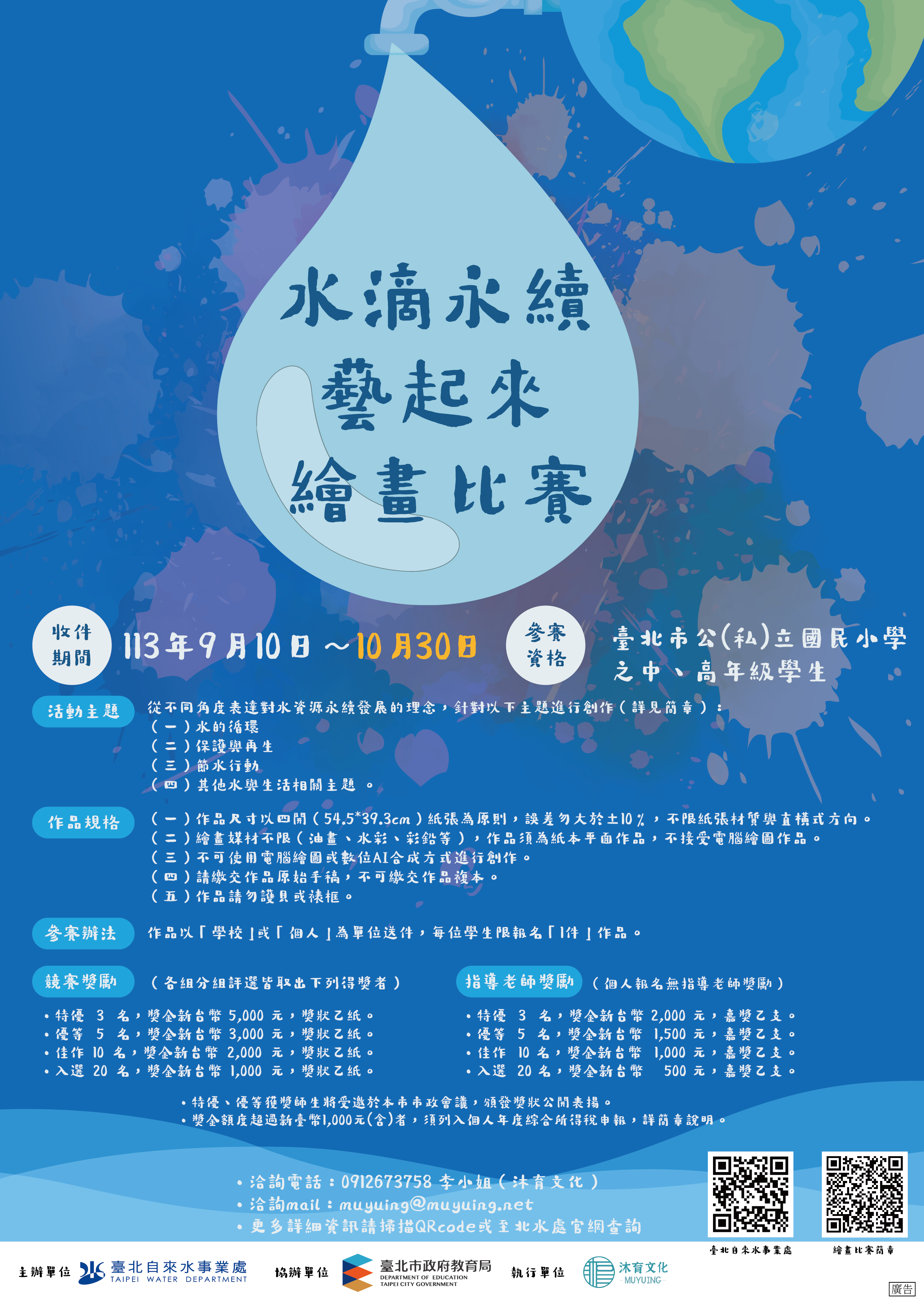 二、檢送113年「水滴永續藝起來」繪畫比賽簡章(修正版)及海報各1份(如附件)。