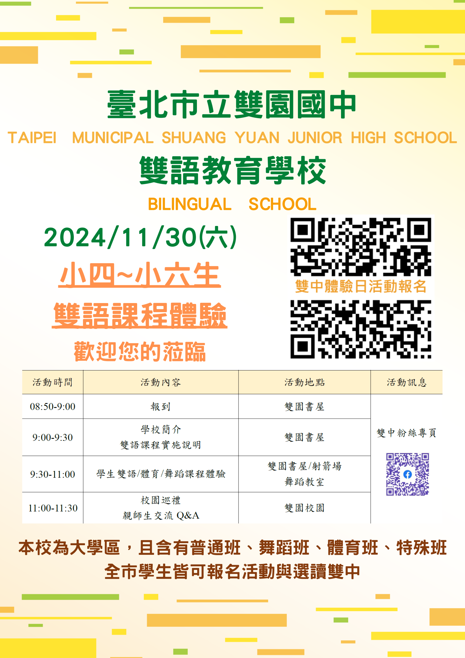 一、本校為雙語學校,並設有普通班、體育班及舞蹈班,期透過本校辦學理念說明、學校簡介及課程體驗等活動,增進國小學生及家長對本校的瞭解與認識。