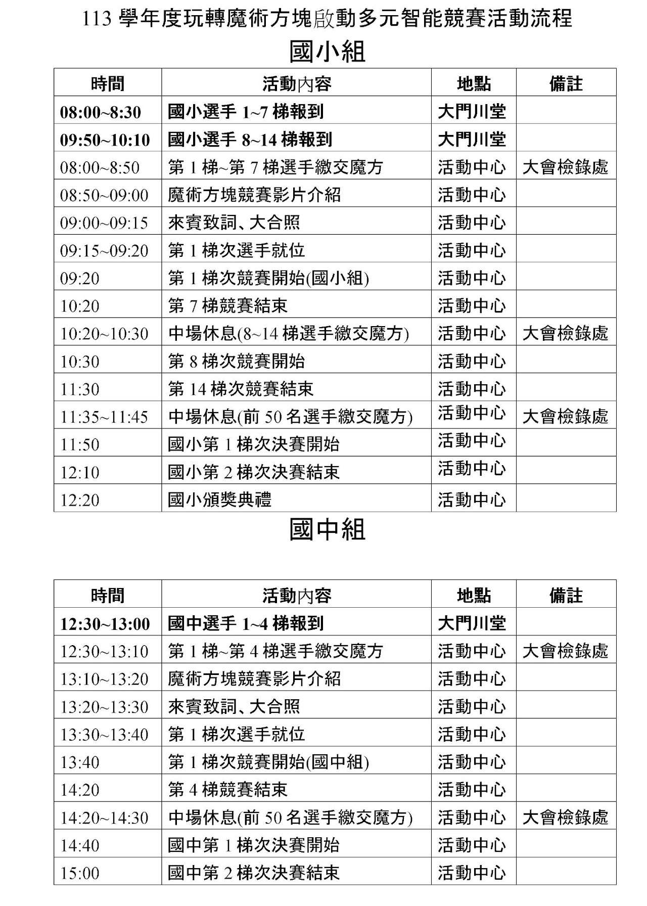 (二)國中組:113年 12月8日星期日 下午1時起1、1~4梯12:30~13: 00 辦理報到 。