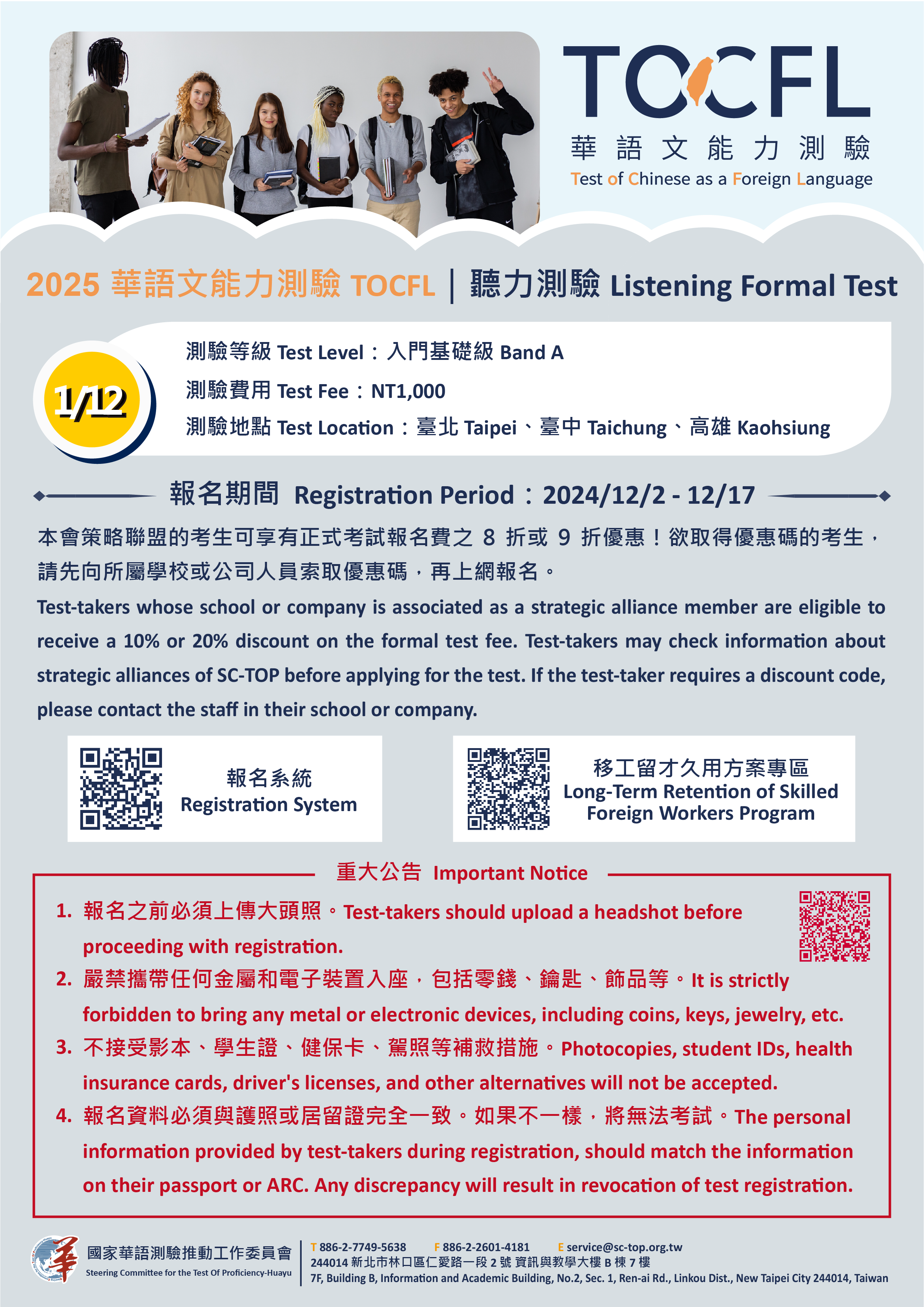 (二)114年1月12日(星期日):聽讀測驗—電腦化適性測驗、聽力測驗入門基礎級(移工留才久用方案)。四、測驗地點