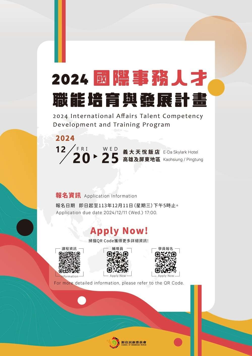 一、為培育具國際視野及國際事務參與能力之青年人才,激發青年就業職能認識,並促進國際原住民族青年間交流,原住民族委員會辦理旨揭活動,敬請協助轉知推廣。