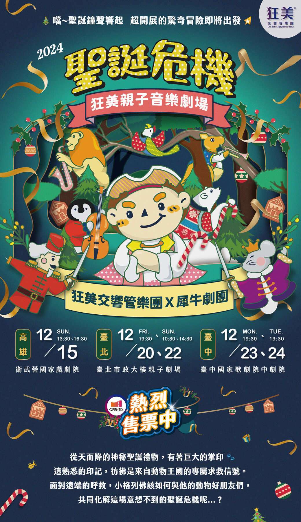一、節目介紹:狂美交響管樂團x犀牛劇團-跨界親子音樂劇場《聖誕危機》從天而降的神秘聖誕禮物,有著巨大的掌印這熟悉的印記,彷彿是來自動物王國的專屬求救信號。面對遠端的呼救,小格列佛該如何與他的動物好朋友們,共同化解這場意想不到的聖誕危機呢...?