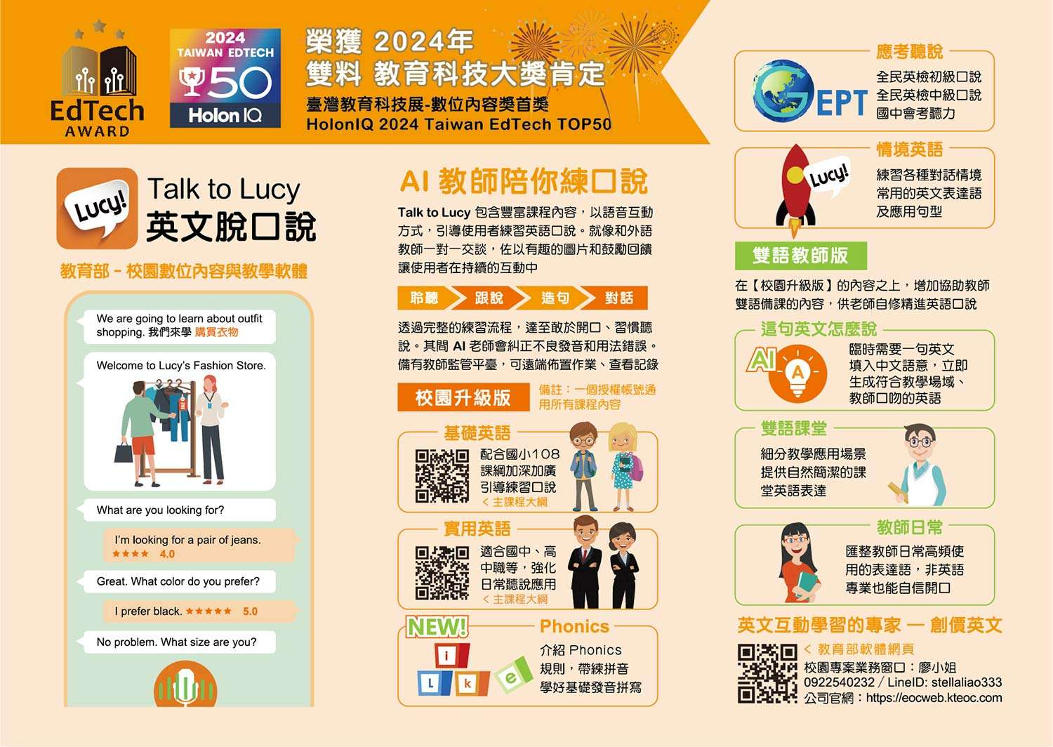 (二)產品「Talk to Lucy 英文脫口說」榮獲2024年臺灣教育科技展「數位內容獎」第一名及 Edtech Icon大獎。