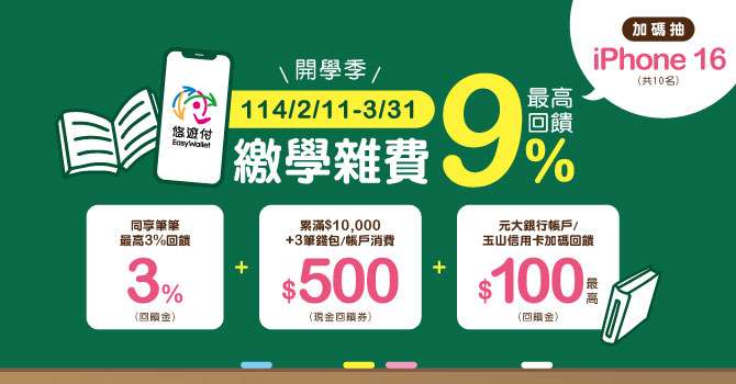 (二)活動內容:活動期間當月使用悠遊付每筆扣款享3%(限量,每戶回饋上限100元)悠遊付回饋金,另累積消費新臺幣(以下同)10,000元加3筆帳戶或錢包消費即回饋500元指定通路現金回饋券,悠遊付綁定元大銀行帳戶或玉山信用卡加碼回饋金(上限100元),活動期間每戶最高回饋9%悠遊付回饋金(或回饋券)。