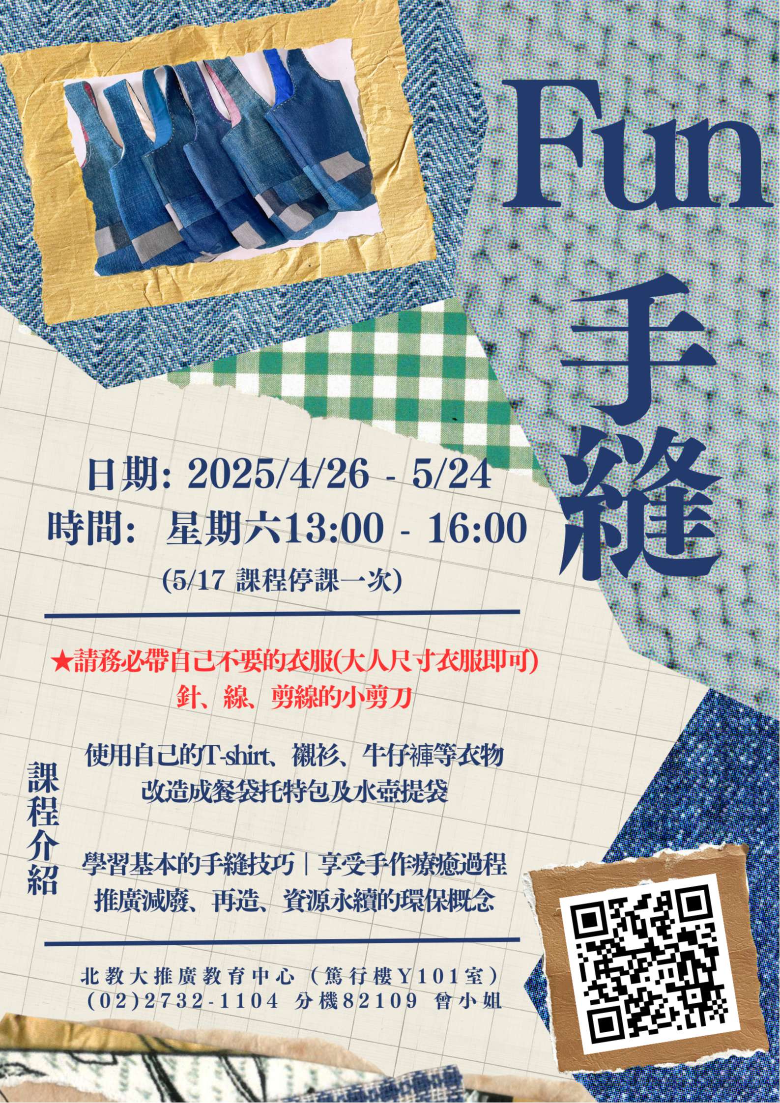一、本校推廣教育中心辦理為期四週的生活藝術系列課程,即日起開放報名,課程資訊如下:生活藝術系列—Fun手縫(HandMay五月場)