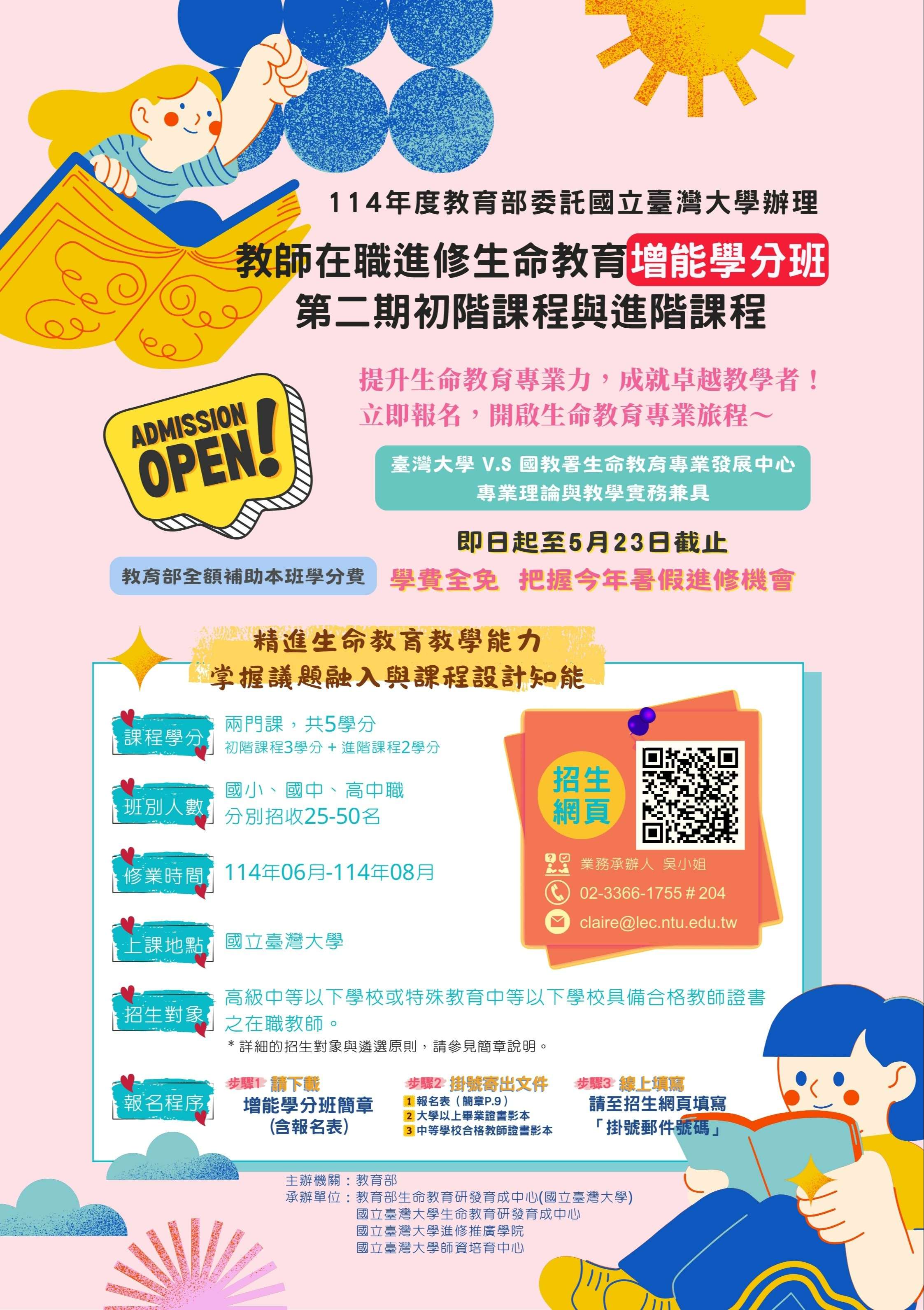 本學分班為國小組、國中組及高中職組各1班,皆含初階課 程3學分及進階課程2學分,學費全免,於114年6至8月上 課,詳細資訊請參閱招生簡章。