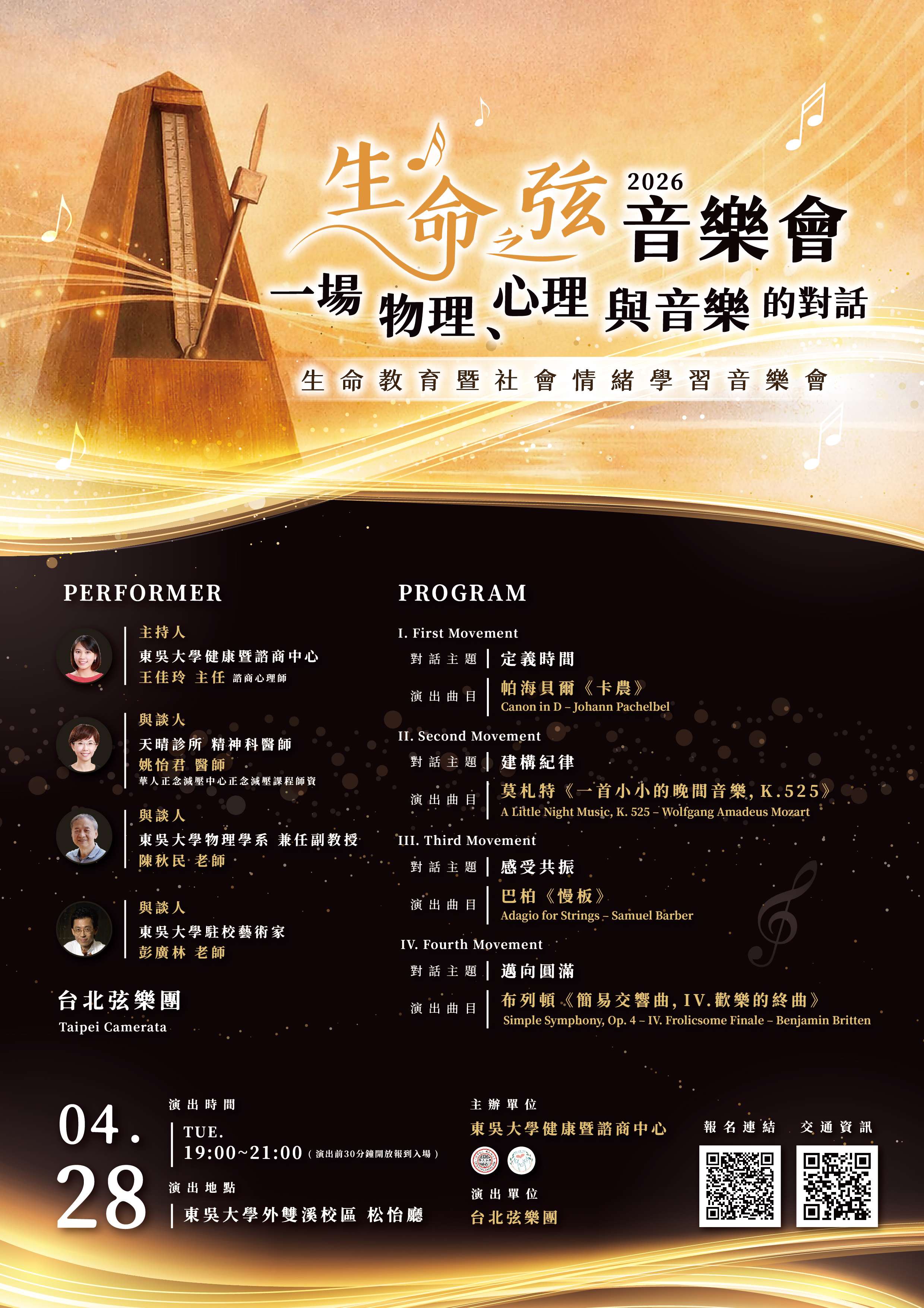 一、為推動生命教育並實踐社會情緒學習(SEL)之精神,本校謹訂於115年4月28日(星期二)舉辦旨揭音樂會。本次活